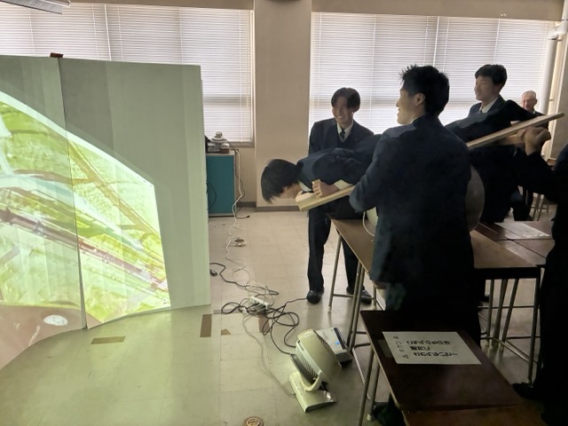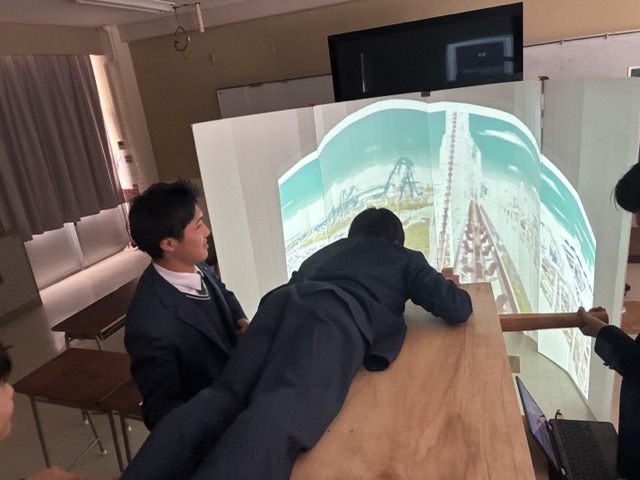 2.没入飛行体験・・・昨年はVRゴーグルを使ってドローン映像に合わせて乗り物(バランスボールに板を載せ,四隅を人間が持つ)を動かしましたが,今回は円形に並べた白いスクリーンに移す試みを行いました。プロジェクタをもっと離して大写しにすればなお良かった