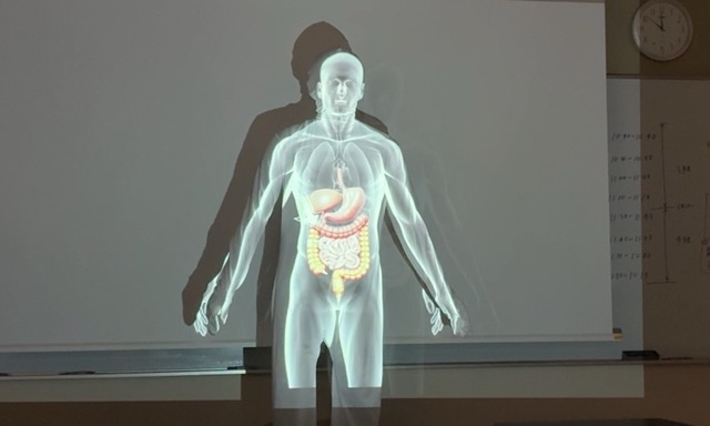 5.人体模型プロジェクション・・・一番評価が高かったもの。全身白タイツに内臓をプロジェクションマッピング。このアイデア自体はかなり前から行われていますが,自分たちで思いついたうえ,生成AIで動きを含めた解説を加えたことで生物の教材として使えるようになっています