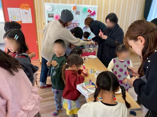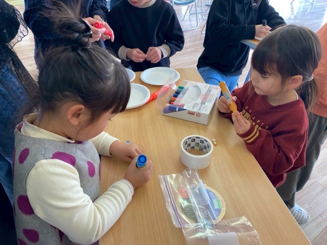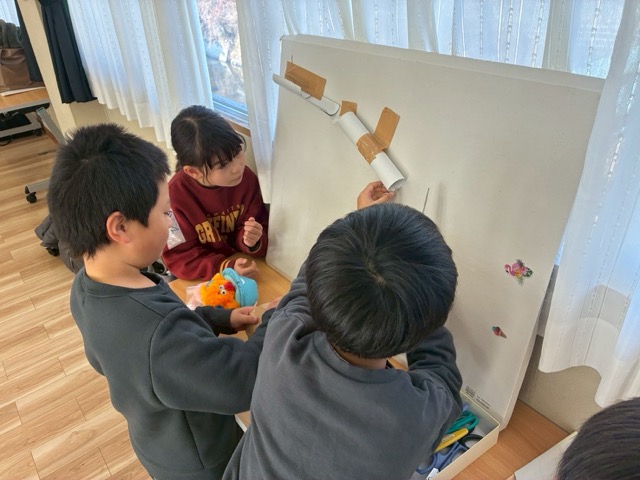 実験のあとは紙芝居,そしてピコピコカプセルでいろんな坂道や紙皿で転がして遊びました。中には自分たちでコースを作る子どもたちもいました。
